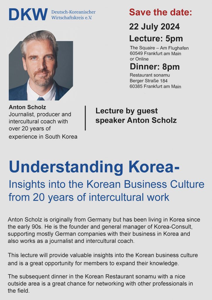 다가오는 2024년 7월 22일 월요일 오후 5시에 개최되는 DKW 행사에 Anton Scholz 씨를 초청 연사로 모시게 되어 매우 기쁩니다.
